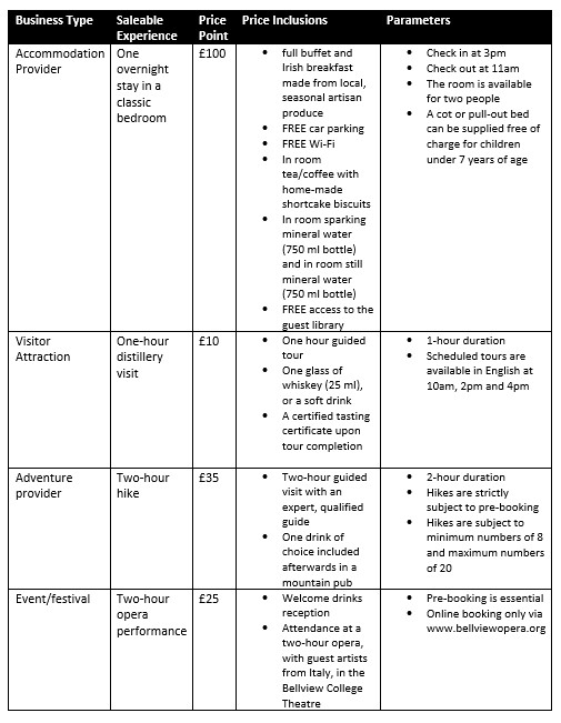 The following table summarises diverse sample saleable experiences in the tourism industry: